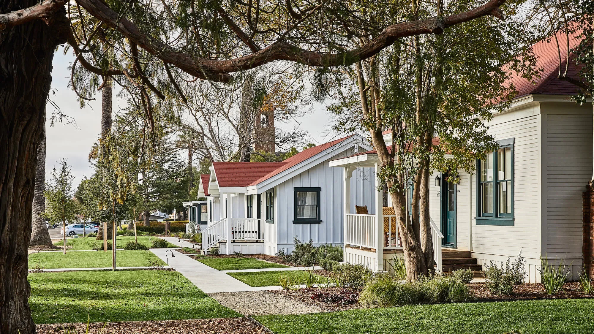 A restored stagecoach inn surrounded by a 6.5-acre property featuring gardens, fire pit hangouts, and guest cottages.